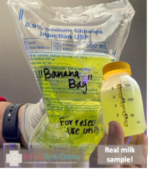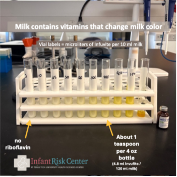 Each tube contains 10 mL of milk with increasing amounts of vitamin solution (starting with 10 mcl and up to 1.5 ml of the multivitamin mix used to make banana bags). The hues most similar to what we see in the submitted photos has the same amount of multivitamins in 1 IV banana bag in a 4 ounce bottle. That is 3.6 mg of riboflavin per 4 ounces of milk…a lot! We suspect riboflavin is actively transported into milk. However, some women take extraordinarily high doses of riboflavin for migraine prevention (400 mg per day), but none have mentioned their neon-green milk to us, so the amount in milk may be variable by person.