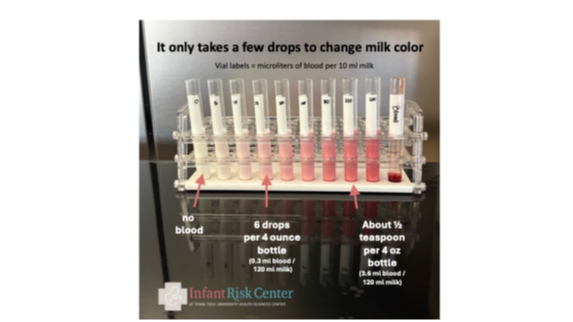 Moms were most concerned about red or pink milk. Acknowledging this concern, we wondered, “how much blood does it take to turn milk pink?” So, we tested it out in our lab.