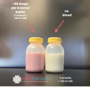 This visibly pink bottle contained about 1 mL of blood in 4 oz (120 mL) of milk